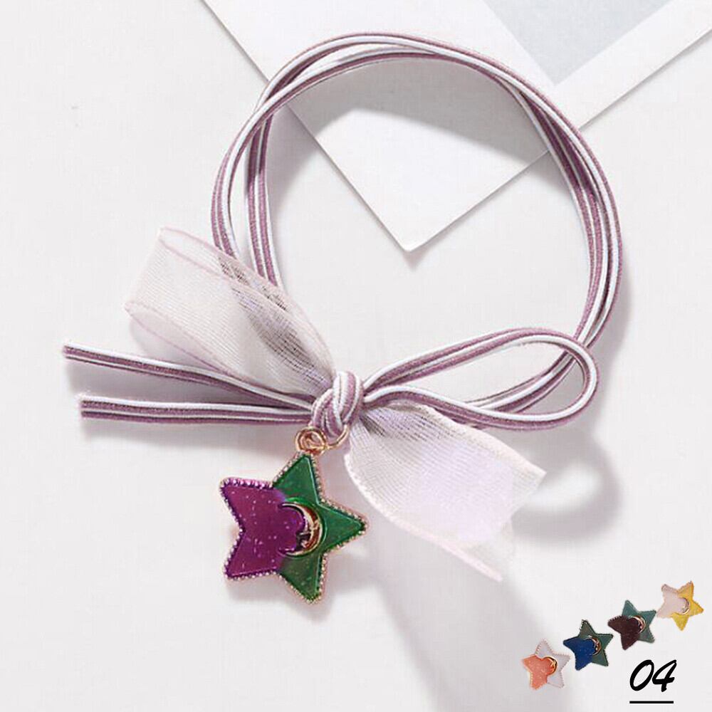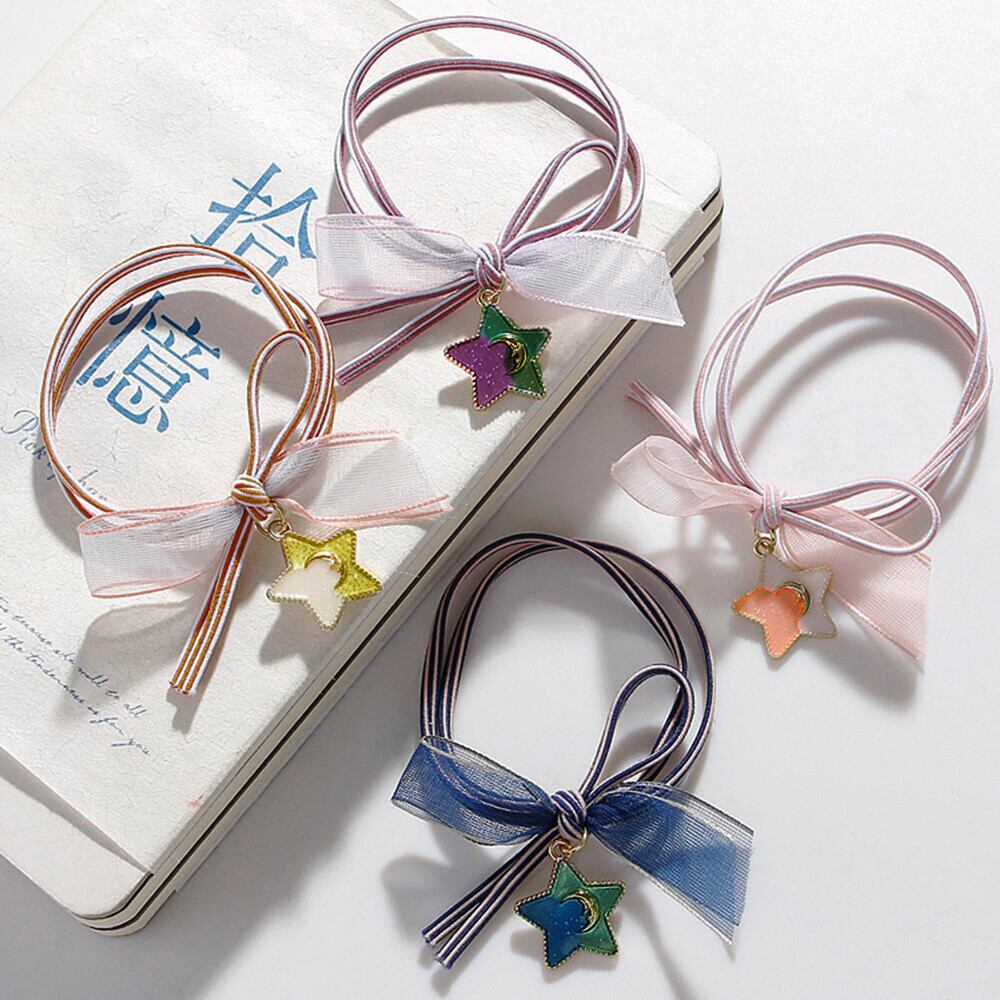 女性らしい細めゴムにシアー素材リボンと月星モチーフチャームのフェミニンヘアゴム