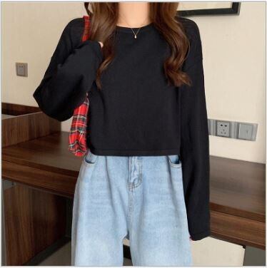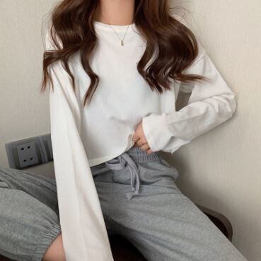ショート丈ロンT 着やせ カットソー ショートトップス Tシャツ オルチャン x-553